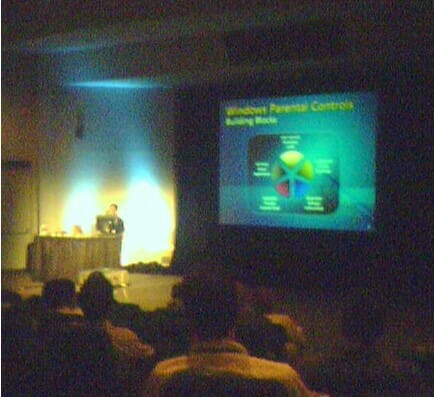 - Netflix und Windows Graphic Foundation: Ein Beispiel der Zukunft? [Video, 155 MB] | | |  | | | |  | | | |  | | | | Zoom-In: Windows Graphic Foundation (Avalon) 14 Uhr, 13. September Andrew Sirotnik, Marketing Manager von North Face und Vie Gundotora (Microsoft) stellen in einer speziellen Windows Presentation Foundation vor und zeigen, wie Avalon beeindruckende Möglichkeiten in der Onlinewelt ermöglicht. Sie sehen beeindruckende Videos eines Abenteuerurlaubs mit flüssigen, voll-texturierten Bedienelementen. - Windows Graphic Foundation und North Face [Video, 60 MB] Das Ziel ist eine emotionale Verbindung zwischen Webdesignern/Herstellern und den Benutzern herstellen als diesen über eine müde HTML-Oberfläche einkaufern zu lassen. Northface und Avalon verwandeln den Shop in eine komplett neue Oberfläche Auf der WGF werden in Zukunft sämtliche Windows-Applikationen programmiert sein. Its the way we expect all Windows applications to be (Vie Gundotra, MS). Somit sehen wir in naher Zukunft Applikationen nicht nur mit schicken 3D-Effekten sondern auch entsprechend eingebetteten Videos. Mittels einfachem Mausklick können wir live unsere Urlaubsausrüstung bei Nort Face zusammenstellen und auch farblich gestalten. | | | |  | | | | Session: Enabling Parental Controls in Windows Vista 14:45 Uhr, 13. September Die nächste Session, Windows Parental Controls, zielt besonders auf besorgte Eltern ab : Zeitlimits sollen die Sessions der einzelnen Benutzer vom Admin via Oberfläche frei regelbar sein. Applikationen werden sich ca. 15 Minuten vor dem Ende einer Session melden und den Benutzer vor der drohenden Abmeldung warnen.. Die Parental Control Beschränkungen gelten nicht nur für Spiele sondern auch für Applikationen oder Internetseiten. Schlichtweg mit allen gefährlichen Inhalten, vor denen Sie Ihre Kinder schützen möchten.  Ein großes Dankeschön an Raymond Wisemann für die Fotos, da sowohl Akku als auch Ersatzakku dank der gewaltigen Keynote-Videos versagt haben Windows Parental Controls sind direkt mit dem Vista-eigenen Games Explorer verbunden: In ihm pflanzen sich alle installierten Spiele automatisch ein. Eine, vom Spieleentwickler generierte XML-Datei (GDF = Game Definition File) enthält spezielle Informationen, Downloads, Patches oder Parental Control Informationen für das jeweilige Spiel. Web Restriction: Keine Pornoseiten oder illegalen Pages mehr? Die Web Restriction (Interneteinschränkung) lässt sich auf bestimmte Internetseiten beschränken (z.B. sämtliche Seiten außer jenen in der Erlaubt-Liste) oder auf bestimmte Kategorien (z.B. Pornographie, Fanseiten von gewalttätigen Spielen etc.) eingrenzen. Meldet sich somit ihr Kind in Windows Vista an, wird der von Ihnen voreingestellte Contentfilter aktiviert und verhindert die Anzeige von HTML- oder generellen Webcode. Somit schützen Parental Controls nicht nur IE7 User sondern jegliche Applikationen, die Webseiten anzeigen (z.B. FireFox). Es gibt auch eine Funktion namens Partially Blocking, die gefährliche Inhalte einer ansonsten harmlosen Seiten (z.B. externe Links) ausblendet oder deaktiviert.