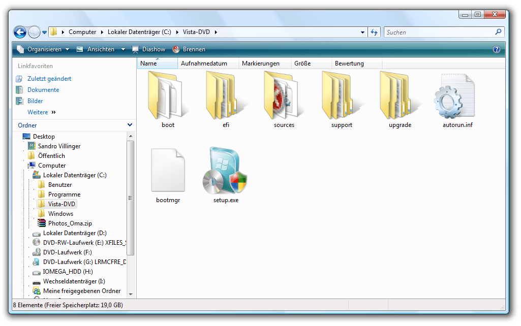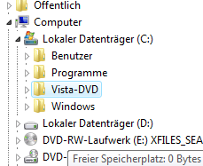 - Halten Sie die Windows Vista Setup-DVD und einen DVD-Rohling parat. Legen Sie zunächst die Setup-DVD ins Laufwerk. Öffnen Sie nun den Arbeitsplatz (oder "Computer" bei Windows Vista) und kopieren Sie sich den kompletten Inhalt der DVD auf einen Ordner der Festplatte. Nennen Sie diesen (beispielsweise) "Vista-DVD". So sieht das dann am Ende aus: