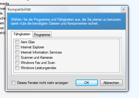 Anwendungserfahrung Bietet den so genannten "Kompatibilitätsmodus" an, den Sie per Rechtsklick auf eine Vernüpfung oder .exe-Datei anwenden können. Damit funktionieren eine Vielzahl von älteren (Vista-inkompatiblen) Anwendungen. Computer Browser Wird nur im Zusammenspiel mit einer Netzwerkdomäne benötigt und stellt dort die Freigaben zur Verfügung. Desktop Window Manager Ist für die Darstellung der 3D-Oberfläche und der schicken Animationen in Windows Vista verantwortlich. Wenn Sie es lieber klassisch mögen (im Windows 2000-Look) können Sie auch hier ein Häkchen setzen und DWM deaktivieren. Diagnose Prüft Ihren Computer auf Probleme und führt z.B. Speichertests oder die Netzwerkreparatur durch. Distributed Link Tracking Client Verfolgt NTFS-Verknüpfungen auf dem Netzwerk nach. Ist in der Regel nicht für den heimische Netzwerkgebrauch notwendig. Fehlerberichterstattung Ermöglicht es Ihnen, Informationen über Abstürze oder Fehlermeldungen an Microsoft zu schicken. Microsoft DFS Abgleich Datensynchronisation für Firmen-Netzwerke, die geographisch weit auseinanderliegen. Für den Heimgebrauch nicht notwendig. Multimediaklassenplaner Sollten Sie nicht entfernen: Damit werden Multimediaanwendungen (z.B. Media Player) eine höhere Priorität eingeräumt als z.b. Antivirensoftware oder Defragmetierungsprogrammen. Offline Dateien Wenn Sie Dateien aus Ihrem Netzwerk auch unterwegs (ohne Verbindung zum Netz) benötigen, können Sie Offlinedateien nutzen, um diese trotzdem zu betrachten ud zu bearbeiten. Diese werden dann später wieder synchronisiert. Remote-Registrierung Hiermit bearbeiten Sie die Registrierungsdatenbank eines Netzwerkcomputers über Ihren Computer. Für den Heimgebrauch ebenfalls sehr selten notwendig. Sekundäre Anmeldung Sie können hiermit Anwendungen unter verschiedenen Benutzerkonten ausführen. Der wichtige Befehl "Als Administrator ausführen" funktioniert aber auch nach der Entfernung der Funktion weiterhin! Taskplaner Führt automatisch geplante Aufgaben durch. Wird u.a. benötigt für die Windows-Defragmentierung! Universal Plug and Play (UPnP) Wird zum Anschluss von (bislang kaum erhältlichen/genutzten) Geräten in eine Netzwerkumgebung genutzt. Können Sie, da es auch ein Sicherheitsrisiko darstellen kann, ruhigen Herzens entfernen. Volume-Schattenkopie Legt von Ihren Dateien eine versteckte Sicherheitskopie an, mit deren Hilfe Sie Änderungen an Dateien rückgängig machen können. Das ist die Funktion "Vorherige Versionen", die Sie im Eigenschaftsdialog von Dateien und Ordner finden. Gleichzeitig basiert auch das Backup und die Systemwiederherstellung auf dieser Funktion. Windows Remote Management Ermöglicht ebenfalls die Fernwartung von verschiedenen Hardwarekomponenten und Diensten. Lediglich für Netzwerkadministratoren notwendig. Windows Suche Die Windows-Suche findet, wie der Name schon sagt, Dateien, Ordner, E-Mails etc. Wenn Sie die Funktion nicht benötigen, können Sie sich eine Menge Ressourcen sparen. Hinweis: Ist für die Sprachpakete (Vista Enterprise, Ultimate) notwendig. - "Image erstellen": Erstellt eine ".iso"-Datei, die Sie beispielsweise mit Nero auf eine CD oder DVD brennen können. Dabei wird eine vollwertige und startfähifge Vista-DVD (oder CD) gebrannt!