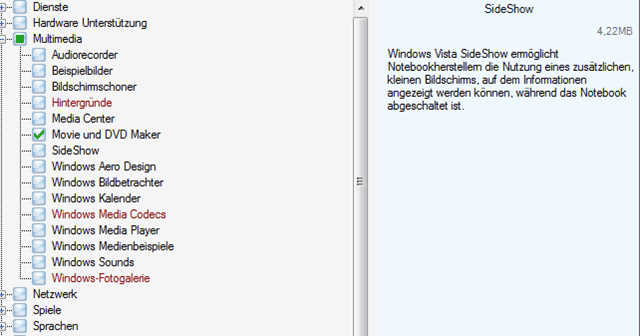 | Windows Media Codecs | Wird zum Abspiele von Multimediadateien (z.B. mp3, avi) benötigt. Diese Funktionalität können Sie aber auch später mit Hilfe eines Codec Packets (z.B. Vista Codec Package) nachträglich installieren. |