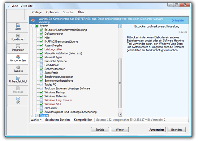 nicht benötigen, müssen Sie einfach (wie im Screenshot) ein Häkchen davor setzen. Zusätzlich zu unseren Beschreibungen finden Sie in der rechten Spalte von vLite auch immer einen kleinen Beschreibungstext.