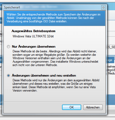 Bestätigen Sie jeweilige Aktion mit (beispielsweise) "Anwenden" und speichern Sie sich die ISO-Datei an einen gewünschten Ort. Achten Sie darauf, dass Sie "Änderungen übernehmen und neu erstellen" anklicken, damit die Enddateien deutlich kleiner ausfallen. Von dort aus kann Sie dann mit Nero oder einem anderen Brennprogramm zur CD/DVD gebrannt werden!