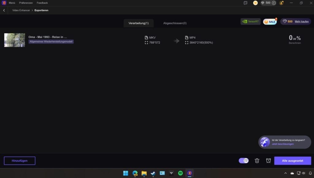 Performance: Ein Aspekt, den man bei VikPea beachten muss, ist die Rechenleistung. In unserem Testlauf zeigte sich, dass komplexe KI-Upgrades zeitaufwendig sein können. Auf einem PC mit mittelmäßiger GPU (GTX 3060 Ti) dauerte das Upscaling eines 1-minütigen Clips auf 4K etwa 5 Minuten. Ohne GPU (nur CPU) war es sogar viermal langsamer. Kurzum: Wer lange Videos verbessern will, braucht entweder einen sehr leistungsfähigen Rechner (moderne NVIDIA/AMD Grafikkarte) oder sollte die Cloud-Funktion in Betracht ziehen. VikPea weist während des Renderns auch darauf hin, dass man Credits für Cloud-Boost kaufen könne, wenn es lokal zu zäh läuft - hier versucht HitPaw offenbar, die Nutzer zur Cloud zu bewegen.