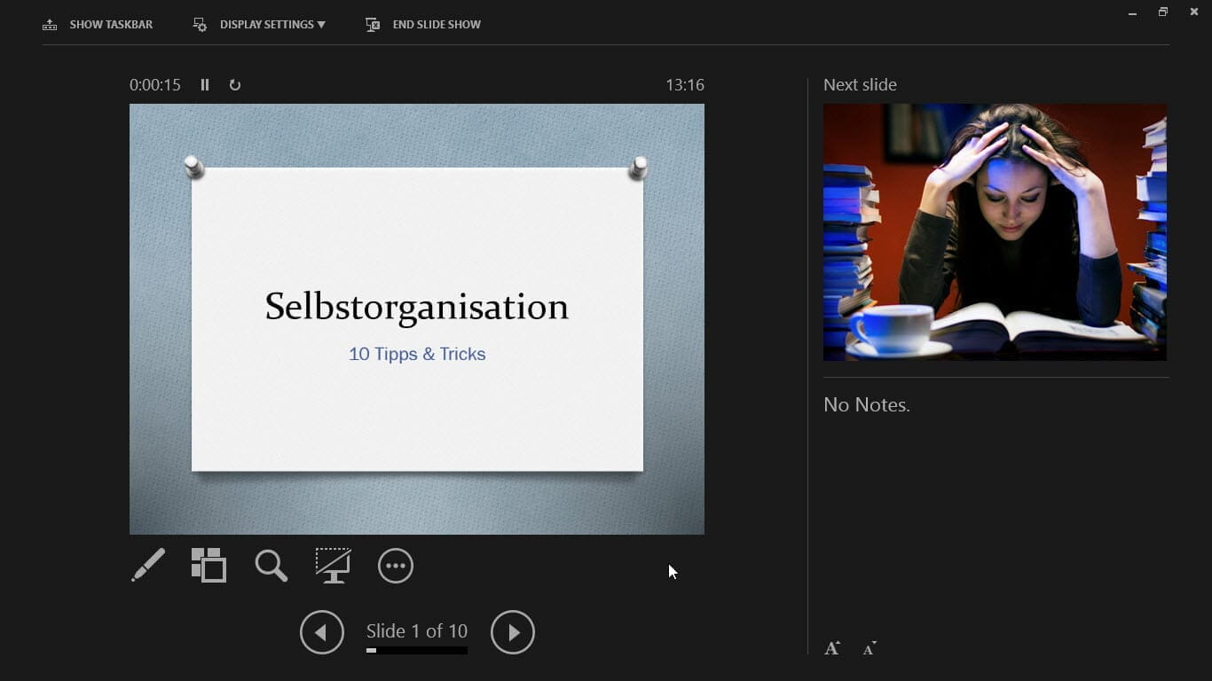Was Vortragende sehr erfreuen dürfte ist die neue Referentenansicht. Diese wurde schon seit einigen PowerPoint-Versionen nicht großartig verändert. Mit PowerPoint 2013 reicht Microsoft einige schon lang fällige, aber doch innovative Features nach: