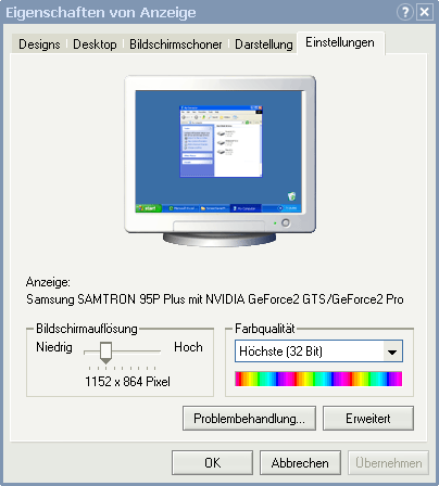 Die perfekten Einstellungen für ein optimales Bild Selbst die erhöhten Bildwerte nach der Treiberinstallation sind noch lange nicht perfekt. Es gilt Sie nun gekonnt auszureizen. Und so gehen Sie vor: 1. Lesen Sie sich den Monitorguide sorgfältig durch und stellen Sie unter Anzeige > Einstellungen ihre Auflösung danach ein. 2. Ich empfehle aufgrund der höheren Bildqualität die Einstellung Farbtiefe auf 32 Bit zu setzen.  3. Klicken Sie nun auf Weitere Optionen und stellen Sie im Register Grafikkarte die Aktualisierungsrate gemäß meinen Empfehlungen vom oben genannten Monitorguide. |