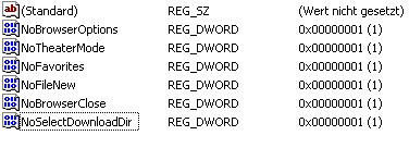 NoBrowserContextMenu: Schaltet das komplette Kontextmenü ab, welches auftaucht, wenn Sie mit der rechten Maustaste in den Internet Explorer klicken.
