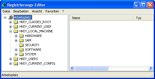 Auf den ersten Blick erkennt man sofort die vom Windows Explorer bekannte Baumstruktur wieder. Allerdings heißen hier die Ordner Schlüssel. Ein Klick auf das + HKEY_LOCAL_MACHINE vor lässt sämtliche Unterschlüssel sichtbar werden. Mit dem - schließen sie diesen Schlüssel wieder. Auch ein Doppelklick tut hier seine Dienste, indem er wie im Windows Explorer die Ordner öffnet.