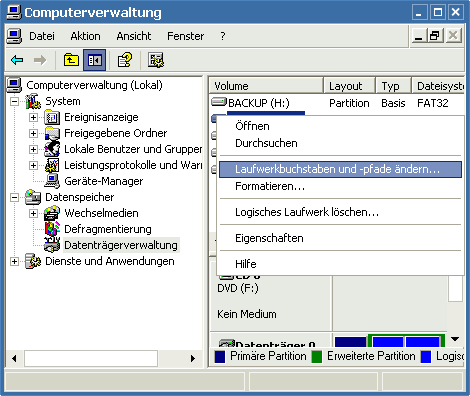 1. Klicken sie nacheinander auf Start > Systemsteuerung > Verwaltung > Computerverwaltung. Ein neues Fenster öffnet sich, in dem sie auf > Datenspeicher > Datenträgerverwaltung klicken.  2. Im rechten Teilfenster sehen sie nun alle Laufwerke ihres Computers. Wenn sie auf das gewünschte rechtsklicken erscheint ein Kontextmenü. Hier wählen sie nun Laufwerksbuchstaben und -pfade ändern. 3. Es erscheint ein Fenster, in dem sie nun auf Ändern gehen. Im daraufhin erscheinenden Fenster, wählen sie nun den neuen Laufwerksbuchstaben aus und bestätigen zweimal hintereinander mit OK. Die folgende Warnung bestätigen sie mit OK. Sie müssen sich allerdings bewusst sein, dass viele ihrer installierten Programme und Spiele nach einer CD fragen, die sich im Laufwerk D befindet. Sie müssten diese dann neuinstallieren.