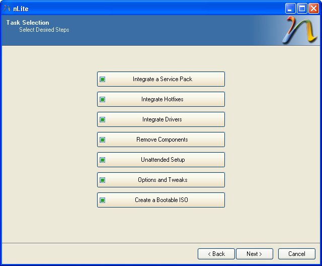 How to start nLite and begin the surgical operation on Windows XP 1. Copy all files and folders from the original Windows XP CD (we used Windows XP Home Edition) into a newly created folder called (e.g.) C:\Home.  2. Now start nLite and confirm the welcome screen by clicking Next. Hit the Browse... button and select the folder where the files of the installation-CD are located (C:\Home in our example). 3. nLite will start analyzing the content and subsequently reassures the identity of your disc. After you have confirmed, youll have the freedom to choose from several options that will affect the size and the extent of your personal Windows XP Reduced Edition. In this guide we go from top to bottom and activate every single entry simply by clicking on it.  4. Click Next (twice, if you dont have any presets to load). Then the nLite assistant asks you to integrate a service pack: Hit Select and choose the Service Pack 2 file (usually xpsp2.exe or WindowsXP-KB835935-SP2-ENU.exe). Note: Service Pack 2 updates your Windows XP with the latest security technology and several fixes that will automatically solve most known problems. You can download it from the Windows XP SP2 Download Page or you can Order a Service Pack 2 CD! 5. nLite will now extract the Service Pack 2 files from the .exe-archive. Click Next and select specific hotfixes that have been released after the SP2 publication (so-called post-SP2 fixes). Note: You can manually download specific hotfixes, patches and security updates from the Windows Update-Catalog! 6. After clicking Next you will be able to integrate device drivers into your personal Windows XP installation-CD. Note: In order to proceed you must first ensure that the .inf-file of your device drivers (e.g. nv4_disp) are already available or extracted since these files will be integrated into the installation. For example, if you have downloaded the latest Nvidia-driver for your graphic card it will be an .exe-file, e.g. called 67.66_win2kxp_international.exe. If you want to extract the necessary files out of the archive you can simply start the setup assistant (by double-clicking it) and select a destination folder. Now discontinue with the installation and open up the directory (e.g. C:\NVIDIA\Win2KXP\67.66), that now holds the nv4_disp.info, through nLite. In most cases drivers come as a .zip-File which can easily be extracted using WinAce! In the extracted folder you will most likely find the .inf-file.  7. Click Next again and select what kind of compatibility you need: - Printers (Local, Network and PDF): Enables the printer spooler that provides support for printing. If your computer is connected to a printer or to a network with a shared printer you might want to keep this feature enabled.