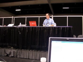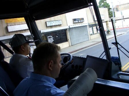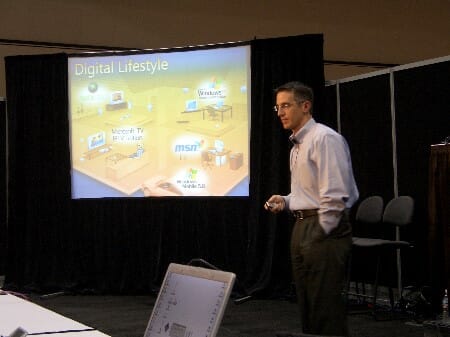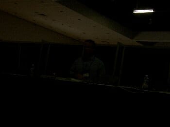 Pressekonferenz: Von Blackouts und Nebeln in Avalon 8:30 bis 22 Uhr Die PDC 2005 ging für registrierte Teilnehmer schon bei den (kostenpflichtigen) Pre-Conference Sessions am 11. September und für uns Presseleute am 12. September los. Daher nutzten wir ein weiteres Mal die bequemen, wenn auch etwas langsameren Shuttle-Busse vom Hotel zum Los Angeles Convention Center. Eine Fahrt, die normalerweise ca. 20-25 Minuten dauert, letztendlich 1 Stunde und 4 Minuten von unserer Zeit verbraten hat und dennoch zu einer der bizarrsten Busfahrten meines Lebens avancierte. Zugegeben, Los Angeles und Umgebung ist gewaltig, doch nimmt man nicht an, dass ein Fahrer eines Shuttle-Busses den Weg zum Convention Center kennt? Sie sagen Ja, ich sage Nein! Selbst die hartgesottensten Optimisten unter uns runzelten die Stirn als der Busfahrer (weit) entfernt vom Convention Center seine Runden im dreckigsten Part von LA dreht. Mehrere von uns checken nochmal eben das Papierschild und vergewissern sich, dass dort Renaissance Hotel - PDC 2005 steht und nicht Renaissance Hotel - Cheap Sightseeing 2005 zu lesen ist. Doch Achtung! Da steht ein nicht zu übersehendes Schild LA Convention Center ->. Endlich sind wir auf dem richtigen Weg. Plötzlich biegt Mr. LA-Tourguide links und wieder links ab. 180 Grad Drehung und ab in die falsche Richtung. Ja, und ab jetzt wurde es lustig, da sich die Insassen langsam in Richtung Fahrer trauten und ein vorsichtiges Sir, do you know what you are doing von sich geben. Jener behält einen kühlen Kopf und geht munter seinen Weg. Erst als ein russischer Teilnehmer der PDC mit seinem Notebook nach vorne trabt und dem Busfahrer aus LA den Weg zum gigantischen und nicht übersehbaren Convention Center zeigt. Bizarr? Noch nicht ganz, denn ca. 5-6 Reihen hinter mir gab es ein Mitfahrer, der durch sein Lachen, das mich an einen fiesen kleinen Hund aus einem Cartoon dessen Titel ich nicht mehr kenne erinnert, den ganzen Bus zum Grinsen brachte.  Wie ein PDC Teilnehmer aus Russland dem heimischen Fahrer aus LA den Weg zum LACC erklärt Die Pressekonferenz: Es wird Schwarz! Endlich in den (praktischen) Presseräumen angekommen, stellte Microsoft die Zukunft des vernetzten Hauses mit Microsoft vor. Er sieht in naher Zukunft einen zentralen Hausserver (IPTV Edition), der bestimmte relevante Daten an die Xbox 360 im Wohnzimmer, der Media Center Edition im Schlafzimmer, Windows Mobile im Auto, MSN am PC und ins Heimkino schickt und von dort auch lädt. Diese Vision wird (leider) nicht weiter erläutert sondern einfach im Raum stehen gelassen, was mich etwas enttäuschte.