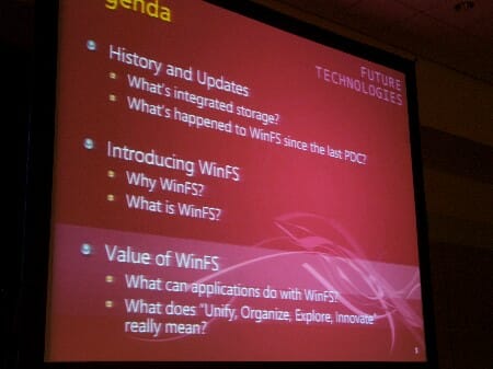 Windows Presentation Foundation (Avalon): Overview of Windows Vista Graphics (Room 502 AB) Leider konnte ich mich nicht dreiteilen, weshalb ich mich für die zukünftige Richtung von WinFS, dem Datenbank-Aufsatz für das NTFS-Dateisystem, entscheide. Nachdem ich mich einmal verlaufen habe (nicht 415 AB sondern 515 AB, man muss nur richtig lesen) komme ich gerade noch pünktlich zur WinFS Session. Der Redner, der bei Microsoft für die Zukunft von WinFS verantwortlich ist, geht zunächst auf zwei essentielle Fragen rund um WinFS ein... Frage 1: Wie kam es zu WinFS? Integrated Storage war schon immer eine Priorität bei Microsoft: Die Vision besteht aus einem Lager (Store) für alle Daten und Ordner. Es gab bereits bei Micrsoft viele sichtbare und unsichtbare Projekte seit den 90er Jahren. Allerdings sei erst die heutige Welt endlich bereit dafür: Daten basieren nicht mehr auf Papier sondern auf digital aufgenommenen Bildern, Dokumenten oder Musik und bietet schon jetzt relationale Daten (Metadaten) aufgrund vieler Technologien oder Geräte (z.B. Digitalkamera). Benutzer möchten nicht mehr länger auf Ordner und Dateien beschränkt sein sondern mit Daten nahtlos umgehen können.  Frage 2: Welche Veränderungen hat es seit der PDC 2003 gegeben? Um WinFS war es seit der PDC 2003 sehr ruhig. Die Entwickler haben sich entschieden, WinFS out-of-band nach Windows Vista zu veröffentlichen. Einer der Hauptgründe war das Feedback, das Microsoft bekommen musste - sie sehen es als komplett neues und revolutionäres Datenmodell, das für (vielleicht) mehrere Jahrzehnte und von unseren Kindern benutzt werden wird. Daher sollte soviel Zeit wie möglich in die Entwicklung und die Betazeit gesteckt werden - schließlich geht es um die Ablösung der klassischen Dateien und Ordner. Trotz dieser unglaublichen Neuerung ist sich Microsoft noch im Unklaren darüber, ob und wie es WinFS für Windows XP (oder früher, was aber unwahrscheinlich ist) anbieten wird. Die Presentation geht nun über zur entscheidenden Frage:  - WinFS Promotion Video: Genialer Überblick zu WinFS [Video, 39 MB] Was ist eigentlich WinFS?