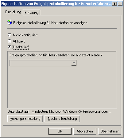Sobald Sie auf Herunterfahren klicken erscheint eine Abfrage, welche den Grund für den Shutdown erfahren möchte. Sollten Sie Windows Server 2003 aufgrund unserer Empfehlung für 35 Euro testen und Sie Heimanwender sind können Sie diese Abfrage getrost deaktivieren. So gehen Sie vor: 1. Klicken Sie auf Start/Ausführen und tippen Sie gpedit.msc ein.  2. Öffnen Sie nacheinander Computerkonfiguration > Administrative Vorlagen > System und doppelklicken Sie auf Ereignisprotokollierung für Herunterfahren anzeigen und markieren Sie Deaktiviert.  Ab sofort sollte die lästige Frage beim Shutdown nicht mehr erscheinen! Ich hoffe, dass Ich ihnen damit ein wenig Zeit erspare! |