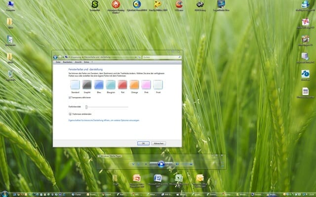 Verwenden Sie hier den Schieberegler und bewegen Sie ihn ganz nach links, um die Farbintensität herabzusetzen. Dann sehen die Fensterrahmen so aus wie auf den Screenshots oben! Das passende Hintergrundbild finden Sie hier: https://www.windows-tweaks.info//grean_ears_by_peehs.jpg
