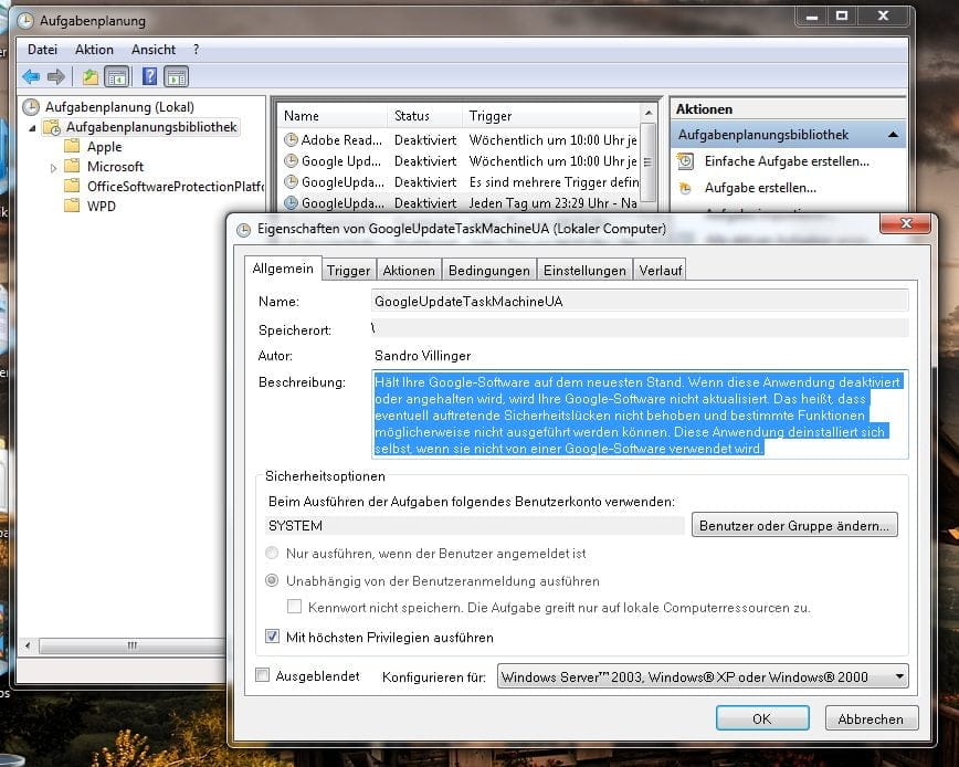 2.    Werfen Sie dann einen Blick auf den "Trigger" – hier finden Sie heraus, wann und in welcher Situation die geplante Aufgabe durchgeführt wird. Im Beispiel sucht Google täglich um 23:29 und bei jeder Anmeldung des Nutzers nach Updates, indem die Datei "GoogleUpdate.exe /c" gestartet wird. Um die Aufgabe auszuschalten, klicken Sie mit der rechten Maustaste darauf und wählen "Deaktivieren".