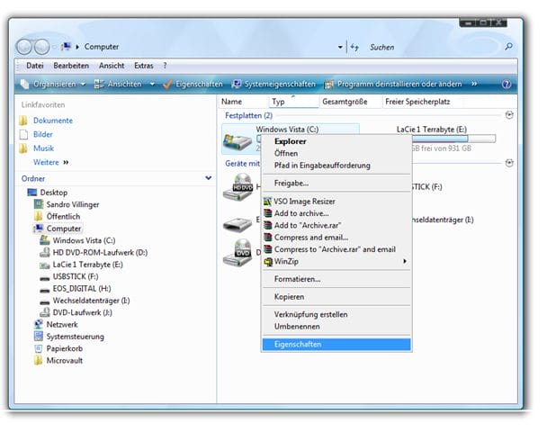 - Klicken Sie im Startmenü auf “Computer”. Weiter geht’s mit einem Rechtsklick auf Ihr Windows-Laufwerk, meist ist das C:.