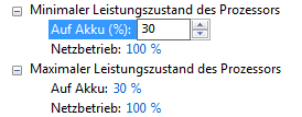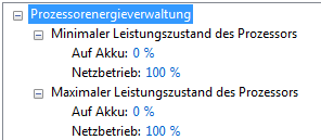 Klicken Sie nun auf "Erweiterte Energieeinstellungen ändern". Es erscheint nun das Fenster "Energieoptionen". Hier scrollen Sie so lange nach unten, bis Sie die "Prozessorenergieverwaltung" sehen. Erweitern Sie diese mit eiem Klick auf das "+"-Zeichen. Erweitern Sie nun zunächst "Minimaler Leistungszustand des Prozessors". Tippen Sie nun bei "Auf Akku" den Wert "0%" ein. Tippen Sie auch bei "Maximaler Leistungszustand des Prozessors" die "0%" ein.