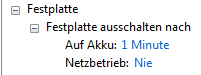 - Festplatte automatisch abschalten: Ebenfalls in den „Energieoptionen“ setzen Sie unter „Festplatte“ die Option „Festplatte ausschalten nach“ auf „1 Minute“ (Auf Akku), damit während der DVD-Wiedergabe oder dem Tippen einer E-Mail die akkuhungrige Festplatte sich zur Ruhe setzen kann. Dies spart im Regelfall zwischen 3 und 5% Akkulaufzeit, da die mechanischen Bauteile der Festplatte (z.B. Spindeln, Schreib-/Lesekopf)