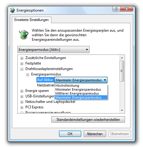 - Wireless-LAN im Stromsparmodus: Wenn Sie unterwegs keine Internet- oder Netzwerkverbindung benötigen, können Sie auch den stromfressenden WLAN-Chip ausschalten. Dieser sucht nämlich sonst permanent nach verfügbaren Netzwerken und ist auch bei einer stehenden Verbindung sehr aktiv. Wenn Sie ihn nicht ausschalten möchten (siehe "Unnötige Geräte abschalten" weiter unten), können Sie auch den Energiesparmodus für WLAN aktivieren. Erweitern Sie dazu in den "Energieoptionen" die "Drahtlosadaptereinstellungen".