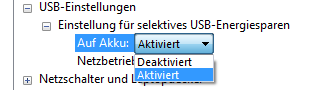 - USB-Anschlüsse im Energiesparmodus: Wechseln Sie nun nach "USB-Einstelungen/Einstellungen für selektives USB-Energiesparen". Hier können Sie mit Hilfe des Eintrags "Aktiviert" bestimmen, dass USB-Anschlüsse nur dann mit Energie versorgt werden, wenn ein Gerät angeschlossen UND aktiv ist. Besonders angeschlossene Geräte (z.B. USB-Sticks, Festplatten, Mäuse, LED-Lampen) benötigen sehr viel Energie, was sich negativ auf die Akkulaufzeit auswirkt. Es ist daher empfehlenswert, wenn möglich, mobil komplett auf (unnötige) USB-Geräte zu verzichten.