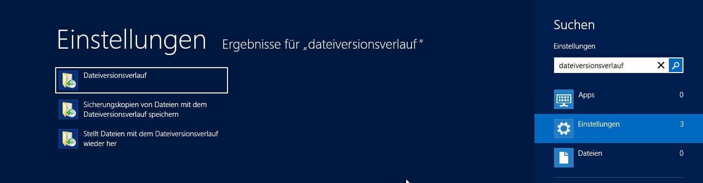 1. Damit der Dateiversionsverlauf arbeitet, braucht Windows eine zweite Festplatte. Dabei kann sich es sich um USB-Laufwerke oder Netzwerkfestplatten handeln. Tippen Sie auf die „Windows“-Taste, um zum neuen Startbildschirm zu gelangen. Tippen Sie dann „Dateiversionsverlauf“ ein, wodurch die Suchfunktion loslegt. Es folgen Klicks auf „Einstellungen“ und dann auf „Dateiversionsverlauf“.