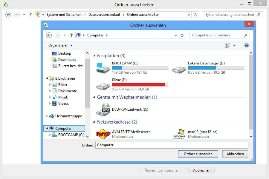 Apple-Nutzer haben die Time Machine, Windows-8-Nutzer den Dateiversionsverlauf. Diese Datenrettungsfunktion sichert Dateien und Zwischenversionen automatisch auf externen Datenträgern wie USB-Sticks oder Netzwerkfestplatten. Einmal eingeschaltet sichert Windows 8 bearbeitete Dateien einmal pro Stunde, natürlich lassen sich auch andere Intervalle wählen. Die Wiederherstellung im Notfall ist mit wenigen Klicks erledigt.
