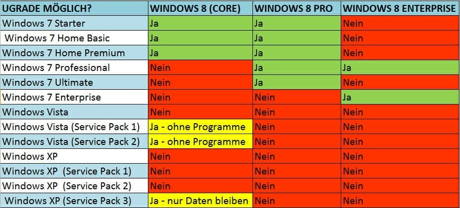 Einzig und allein Windows 7 ermöglicht Upgrades, die alle vorhandenen Programme, Einstellungen und persönlichen Dateien ins neue Win 8 mitnehmen. Unter Vista geht beim Upgrade die installierte Software verloren. XP erhält nur die eigenen Dateien. Hier der Upgrade-Überblick: